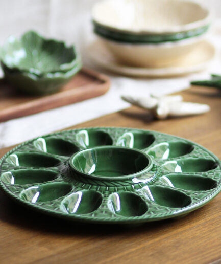 La bandeja para huevos es una pieza muy típica de las mesas lusas y muy querida por los españoles y es que a nosotros también se nos da bien esos de hacer huevos rellenos. Además esta bandeja lleva en el medio un hueco para salsa muy práctico. Está fabricada artesanalmente y adaptada para el uso diario por lo que puedes meterla en lavavajillas y microondas.