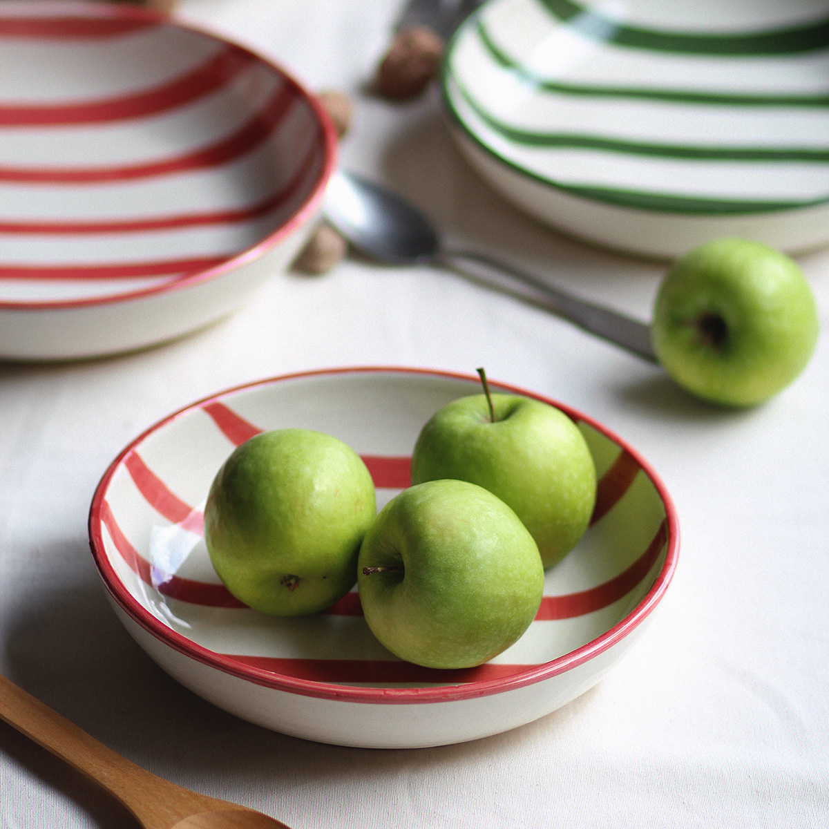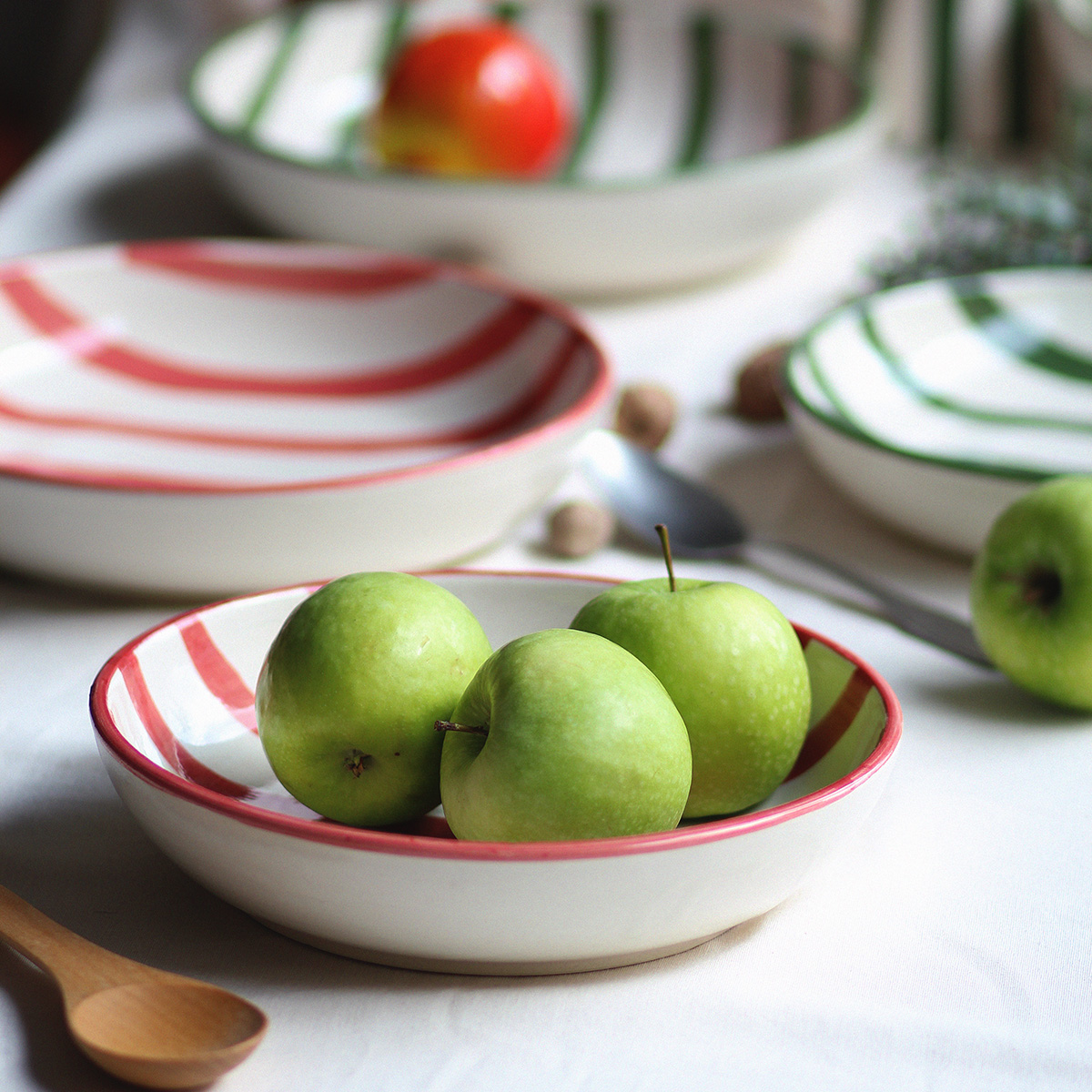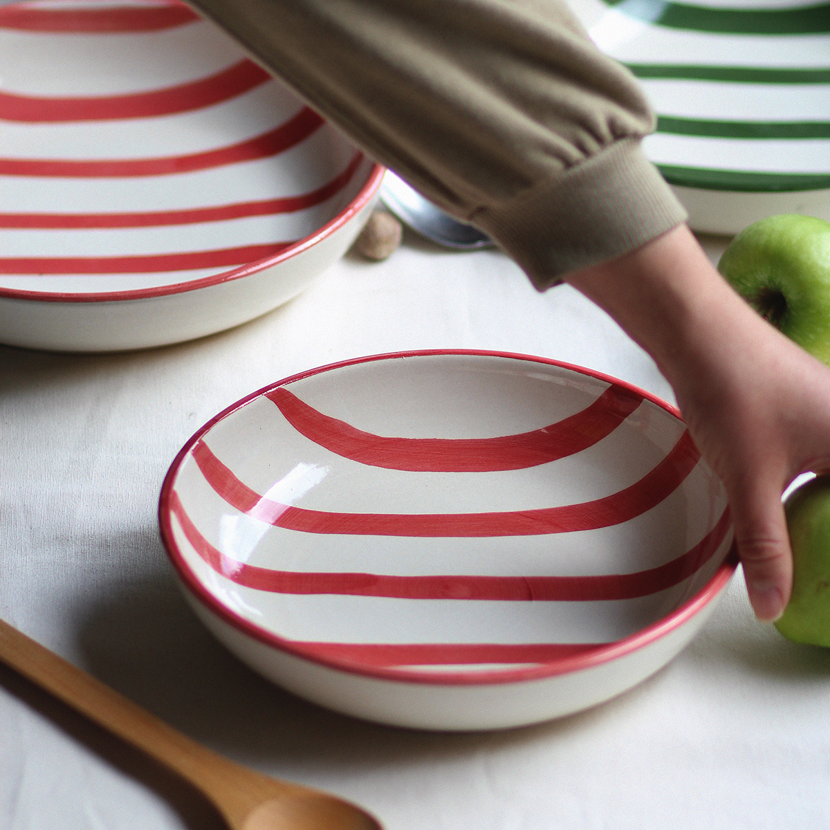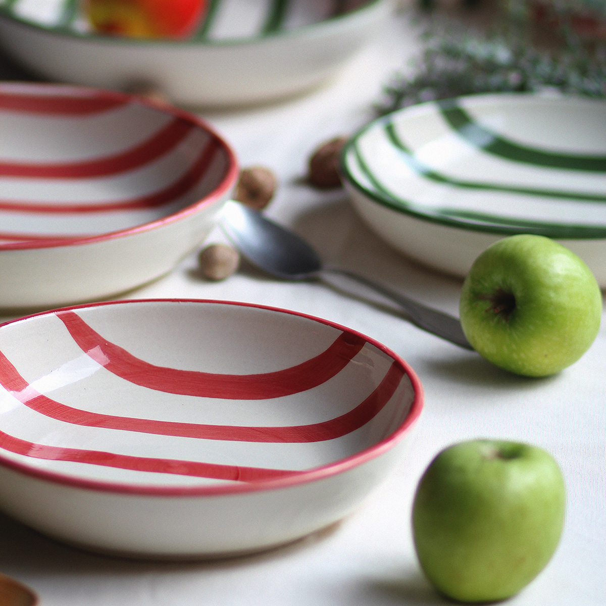 Los tonos verdes, rojos teja y blancos evocan la tierra, el sol y la mesa mediterránea: comidas largas, sobremesas compartidas y el placer de lo cotidiano. Las formas son sencillas y honestas, pensadas para acompañar el día a día con naturalidad.