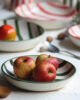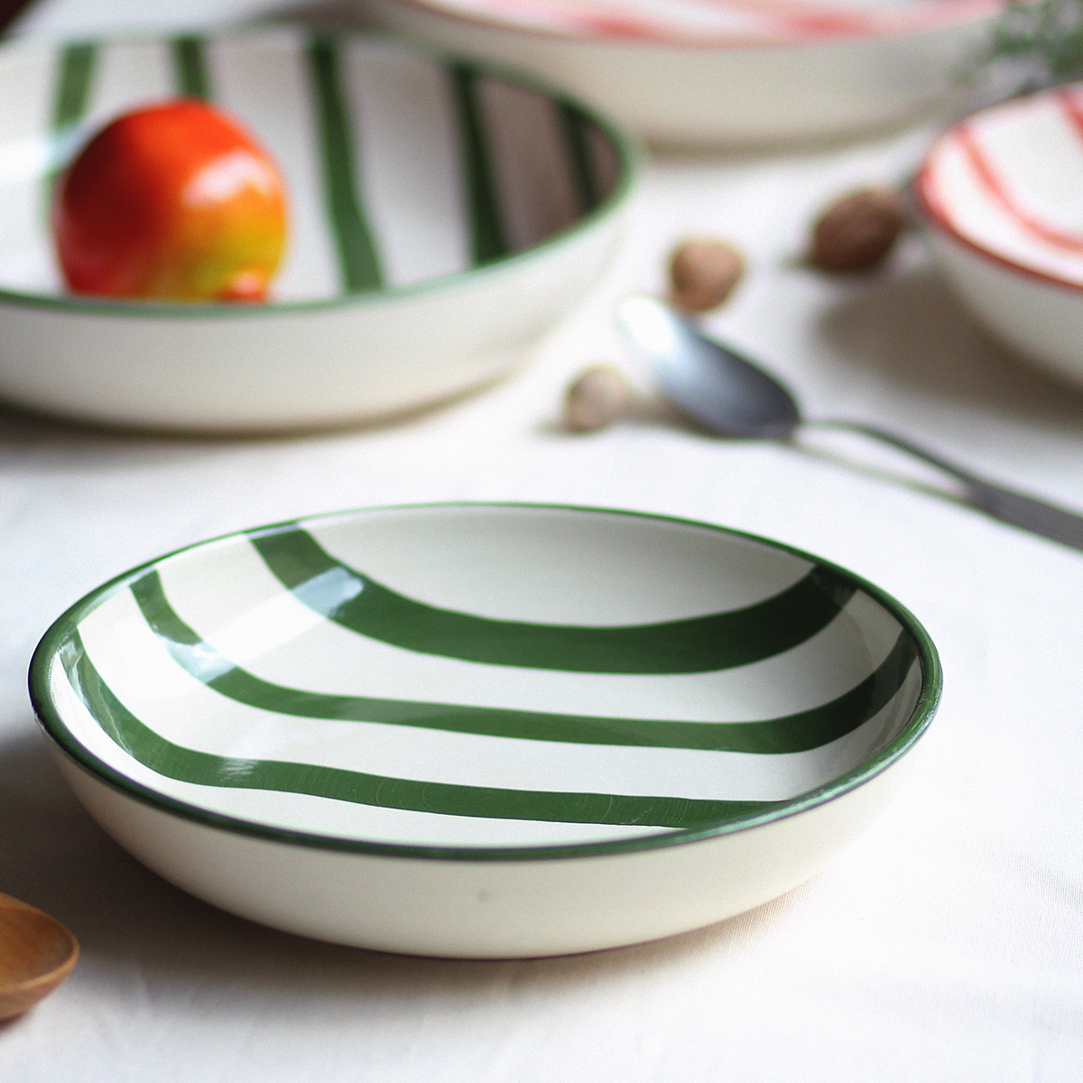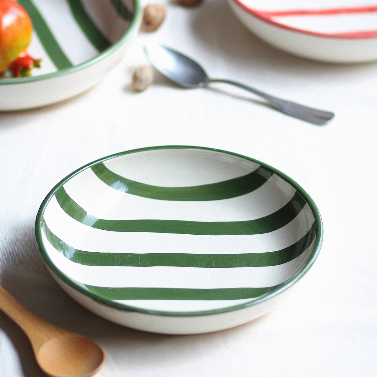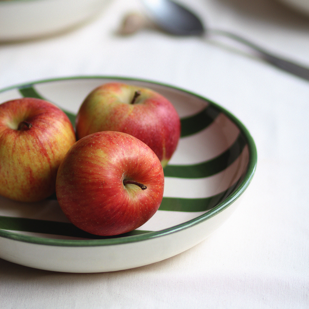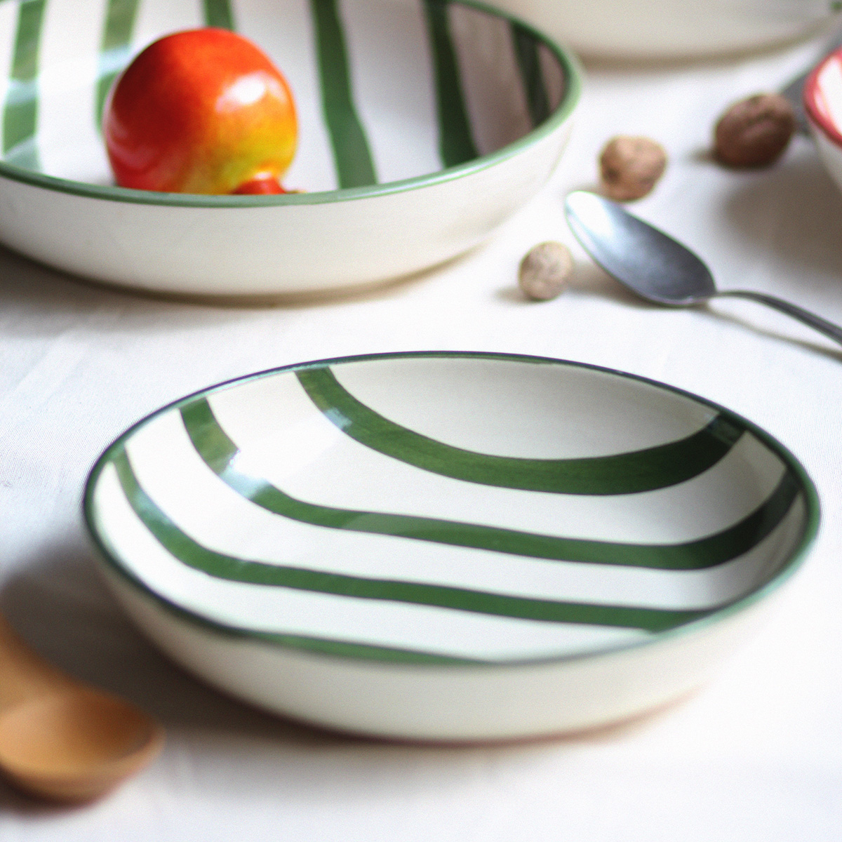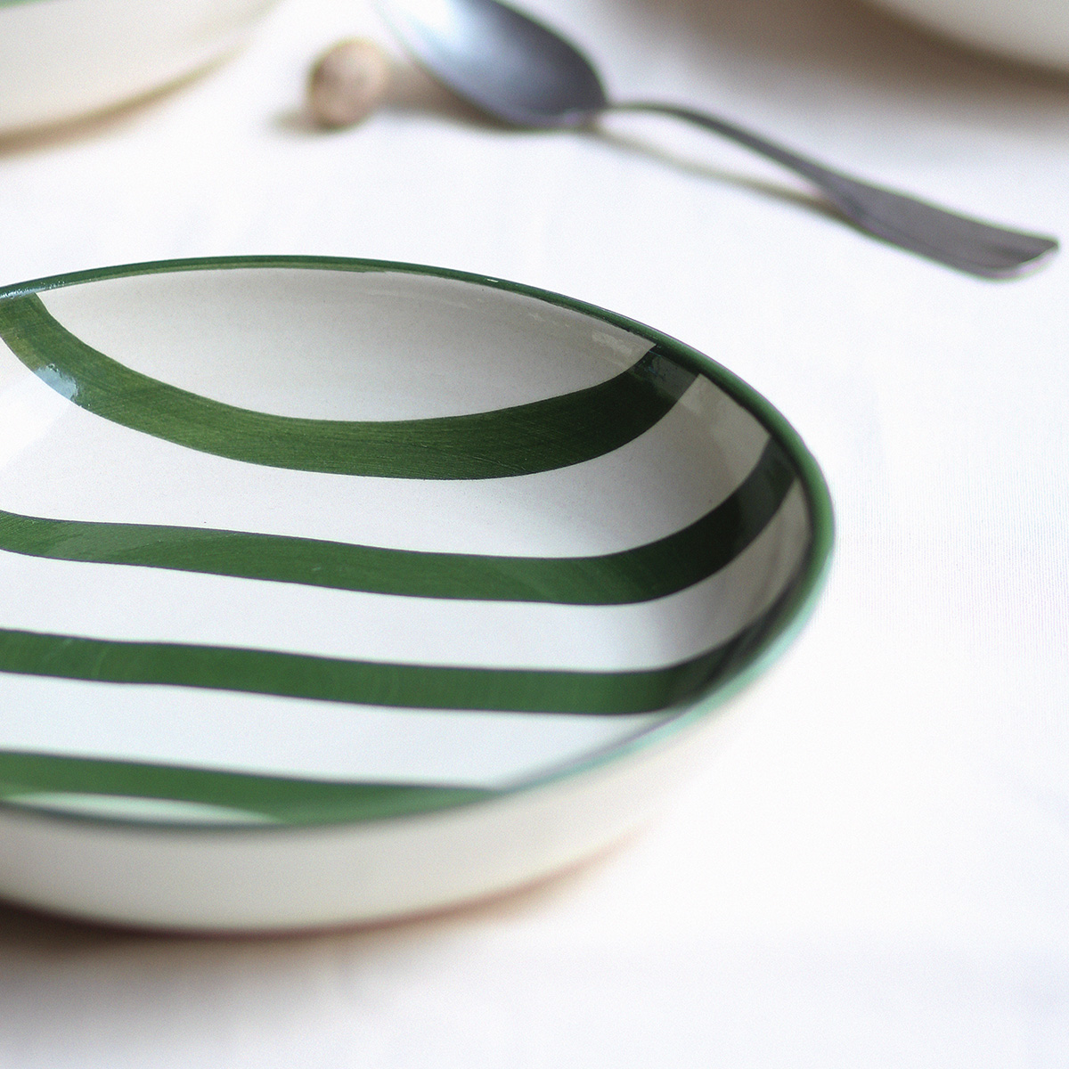 Los tonos verdes, rojos teja y blancos evocan la tierra, el sol y la mesa mediterránea: comidas largas, sobremesas compartidas y el placer de lo cotidiano. Las formas son sencillas y honestas, pensadas para acompañar el día a día con naturalidad.