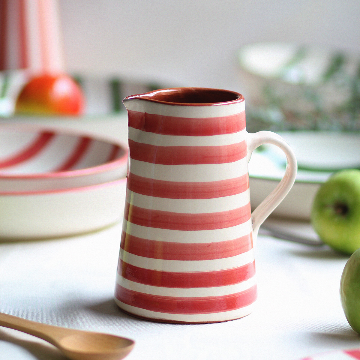 Los tonos verdes, rojos teja y blancos evocan la tierra, el sol y la mesa mediterránea: comidas largas, sobremesas compartidas y el placer de lo cotidiano. Las formas son sencillas y honestas, pensadas para acompañar el día a día con naturalidad.