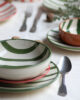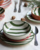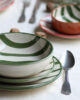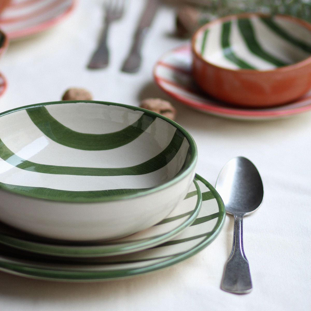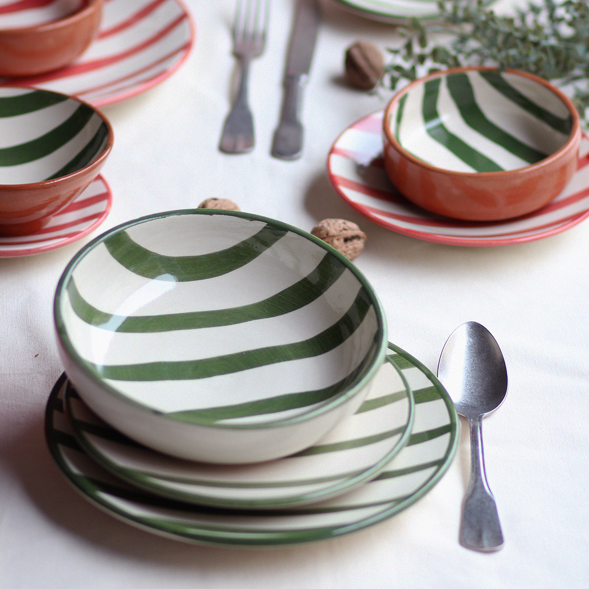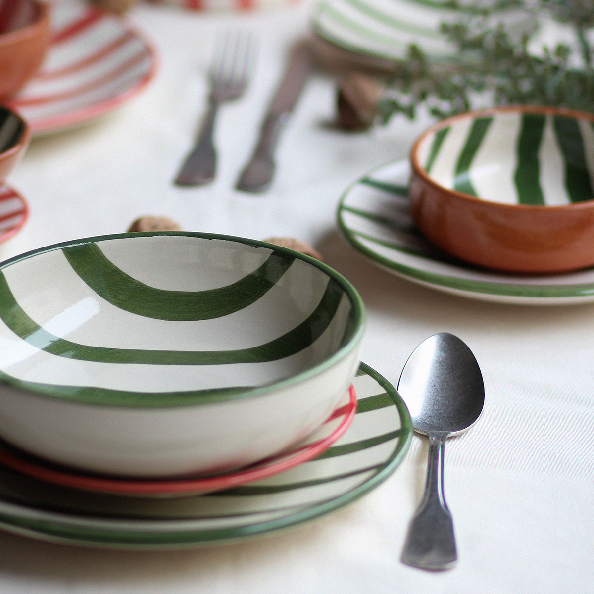 Los tonos verdes, rojos teja y blancos evocan la tierra, el sol y la mesa mediterránea: comidas largas, sobremesas compartidas y el placer de lo cotidiano. Las formas son sencillas y honestas, pensadas para acompañar el día a día con naturalidad.